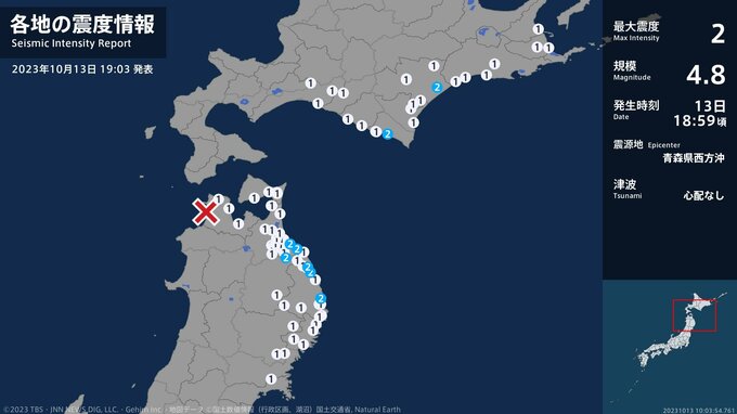 震度2 青森県西方沖 19:00ごろ