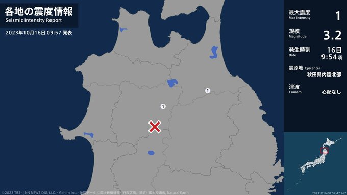 震度1 秋田県内陸北部 09:54ごろ