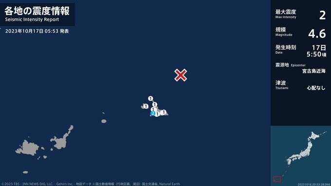震度2 宮古島近海 05:50ごろ