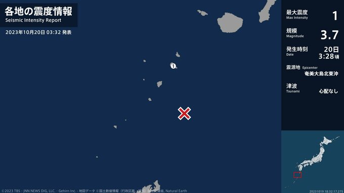 震度1 奄美大島北東沖 03:28ごろ