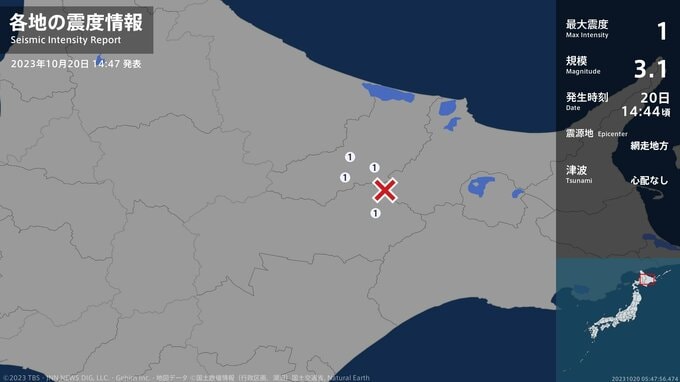 震度1 網走地方 14:44ごろ