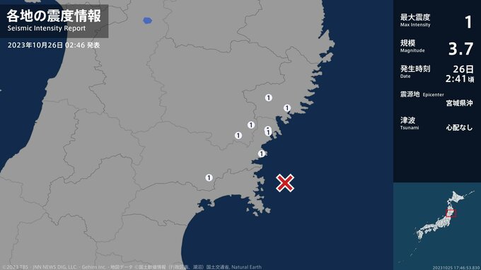 震度1 宮城県沖 02:41ごろ