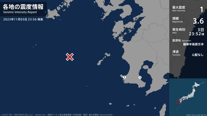 震度1 薩摩半島西方沖 23:53ごろ