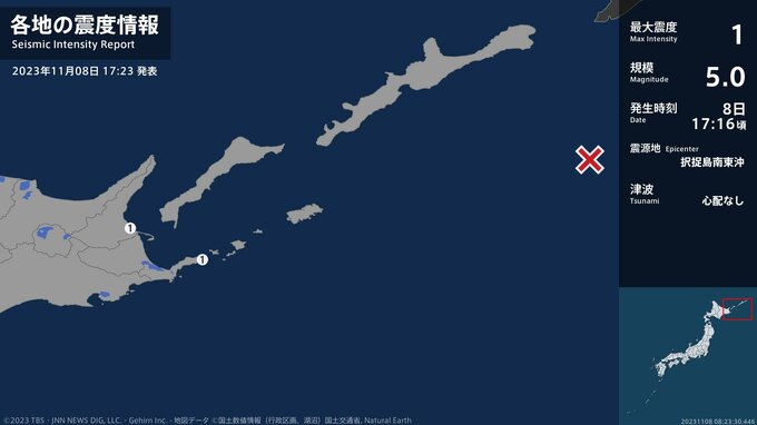 震度1 択捉島南東沖 17:17ごろ