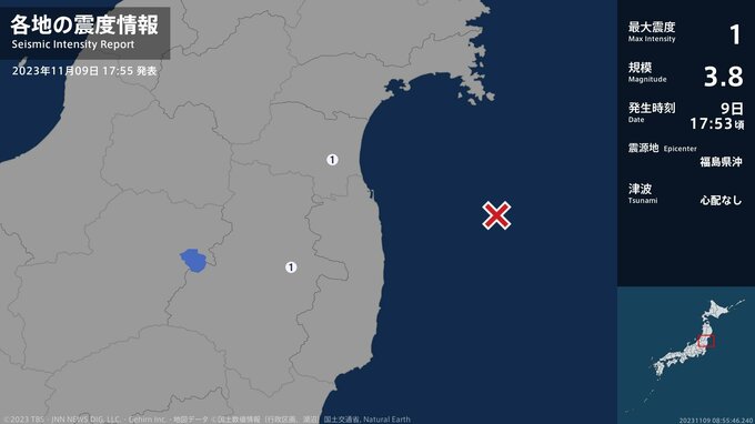 震度1 福島県沖 17:53ごろ