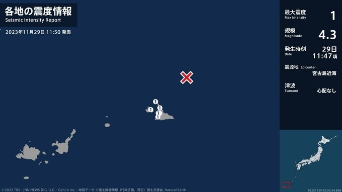 震度1 宮古島近海 11:47ごろ