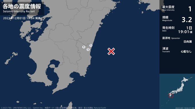 震度1 日向灘 19:01ごろ