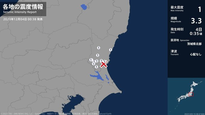 震度1 茨城県北部 00:36ごろ