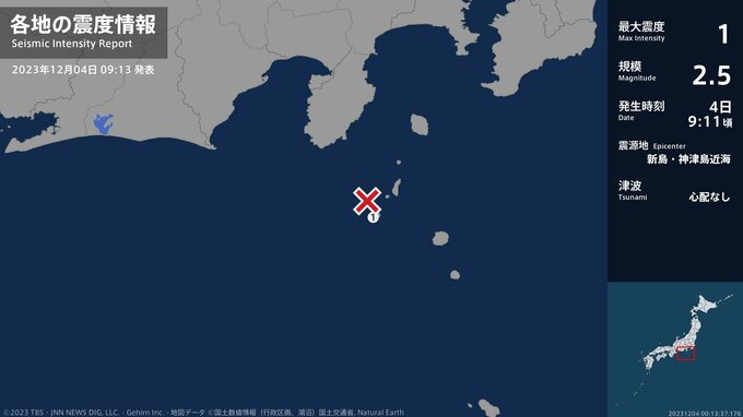 震度1 新島・神津島近海 09:11ごろ