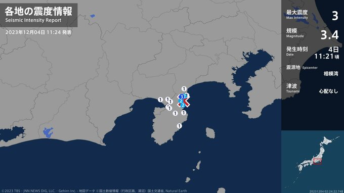 震度3 相模湾 11:21ごろ