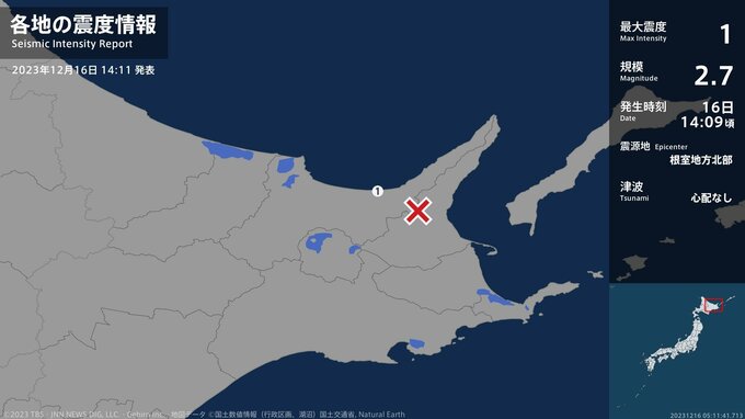 震度1 根室地方北部 14:09ごろ