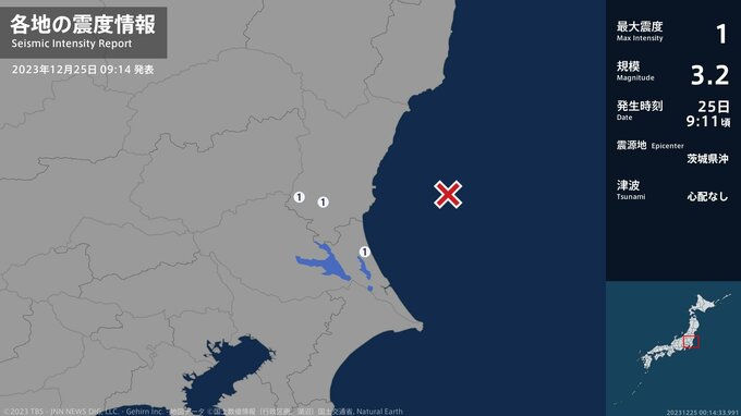 震度1 茨城県沖 09:11ごろ