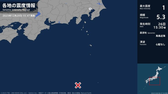 震度1 鳥島近海 15:31ごろ