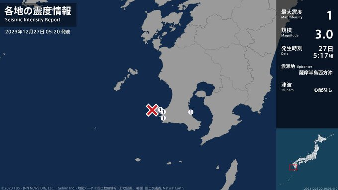 震度1 薩摩半島西方沖 05:17ごろ