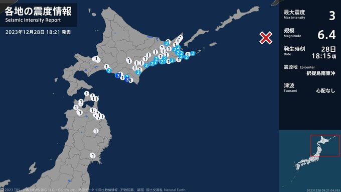 震度3 択捉島南東沖 18:15ごろ