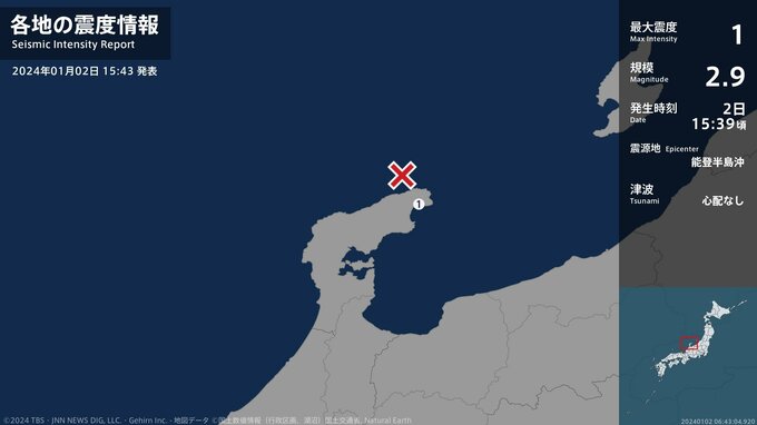 震度1 能登半島沖 15:39ごろ