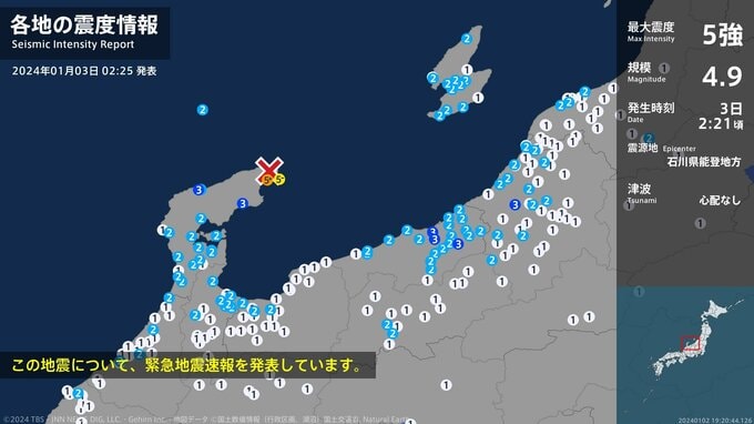 震度5強 石川県能登地方 02:21ごろ