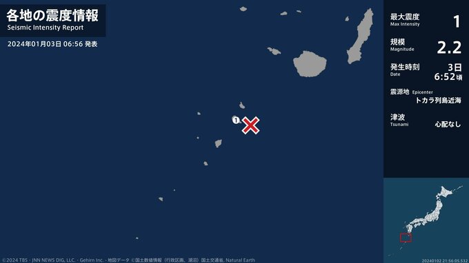震度1 トカラ列島近海 06:52ごろ