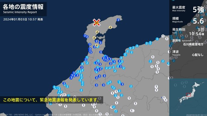 震度5強 石川県能登地方 10:54ごろ