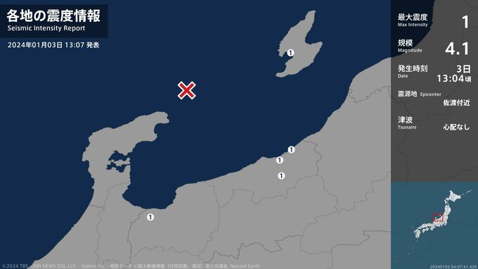震度1 佐渡付近 13:04ごろ