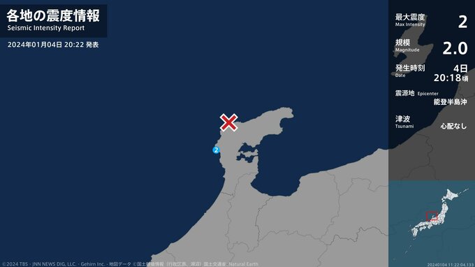 震度2 能登半島沖 20:19ごろ