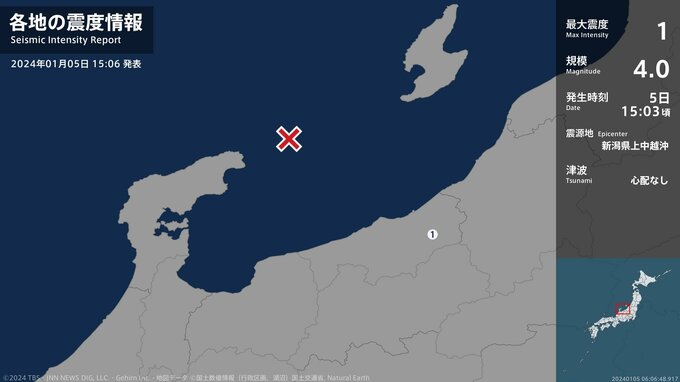 震度1 新潟県上中越沖 15:03ごろ