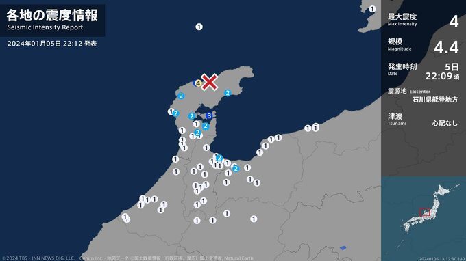 震度4 石川県能登地方 22:09ごろ