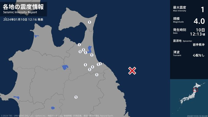 震度1 岩手県沖 12:13ごろ
