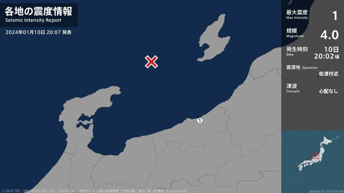 震度1 佐渡付近 20:02ごろ