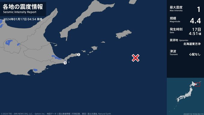 震度1 北海道東方沖 04:51ごろ