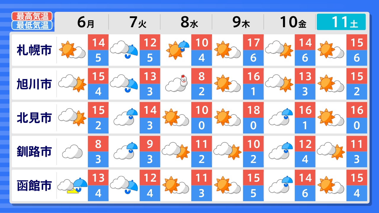 稚内市 留萌市 旭川市 紋別市 網走市 北見市 釧路市 帯広市 根室市 岩見沢市 札幌市 倶知安町 浦河町 室蘭市 函館市 江差町