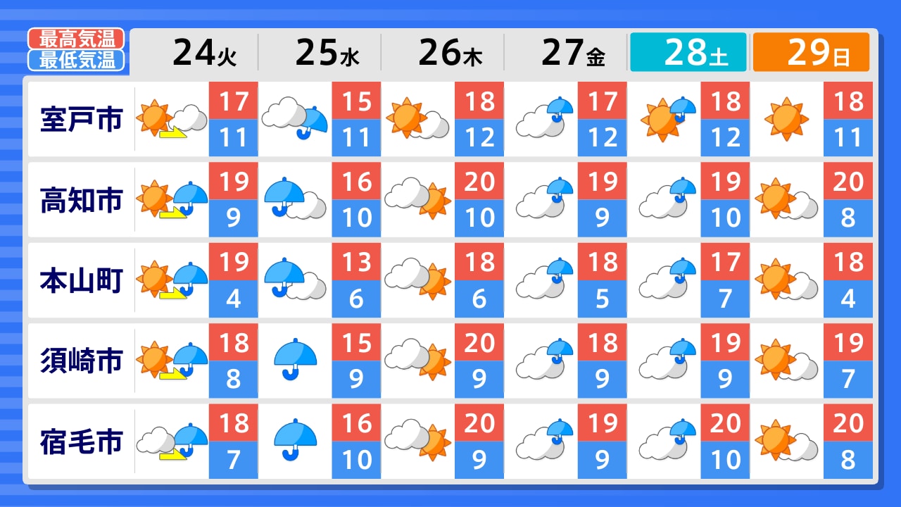 梼原町 四万十町 宿毛市 土佐清水市 須崎市 本山町 高知市 安芸市 馬路村 室戸市