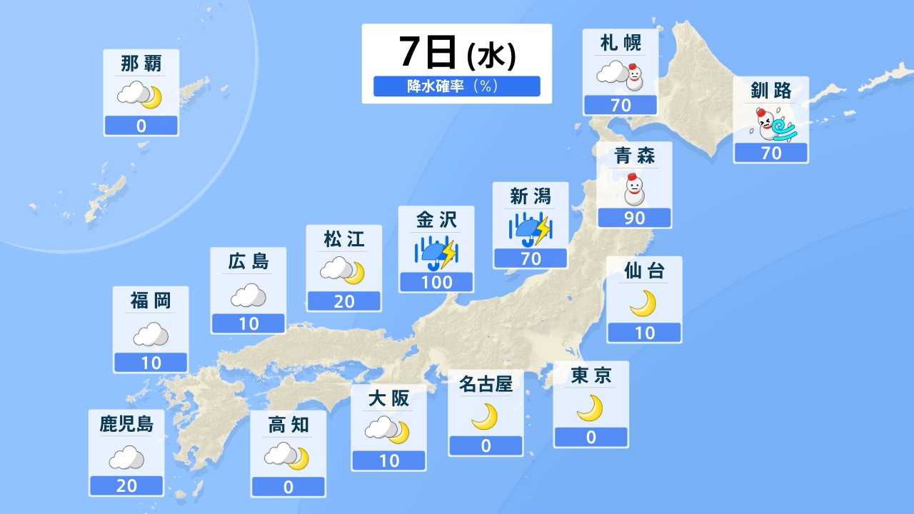 【近畿の天気】8日(木)は寒中らしい風の冷たさ 冬型の気圧配置で北部を中心に雪 北ほど折りたたみ傘を持って