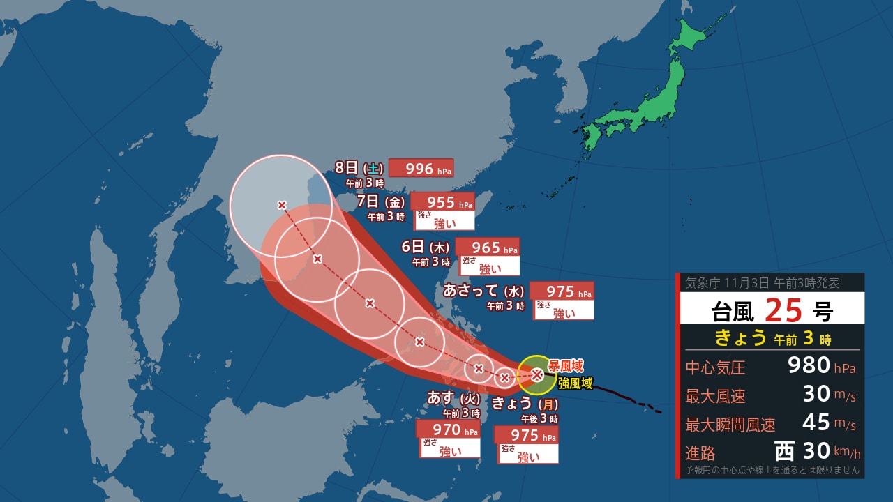 11月に発生した台風25号 1時間に約20キロの速さで西北西へ このあとどこへ?