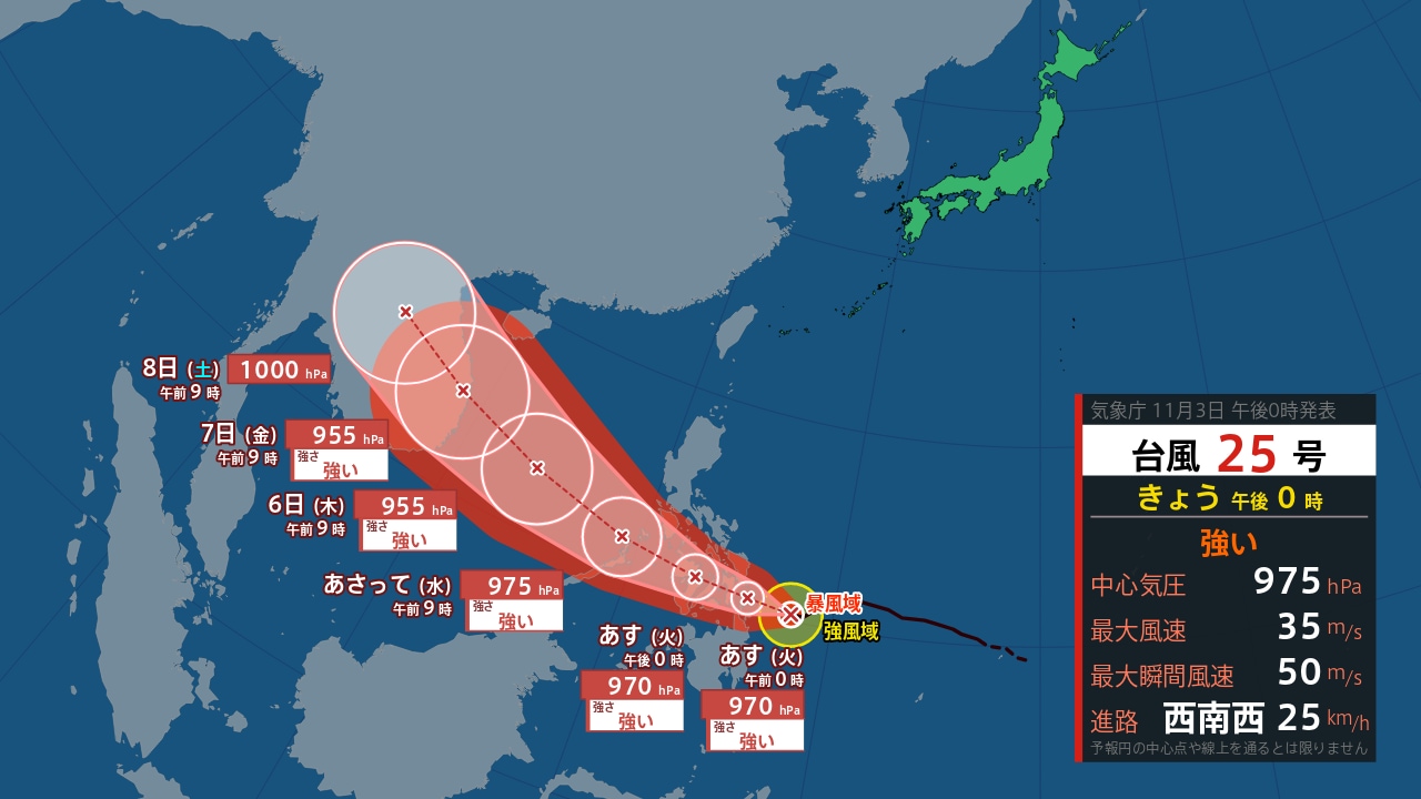 11月に発生した台風25号(カルマエギ)はフィリピン東を時速25キロの速さで西南西へ このあとどこへ?