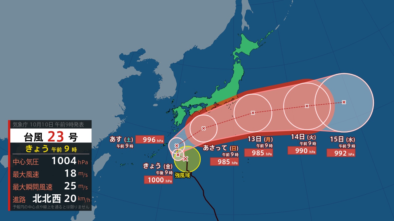 【台風23号】9日までの予想より東寄りの進路で12日にかけ再び八丈島の方面へ 10日は大東島地方で激しい雨に警戒(10日正午現在)